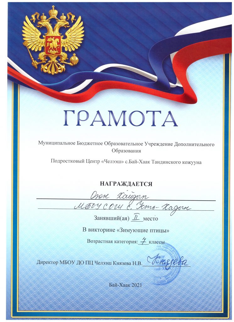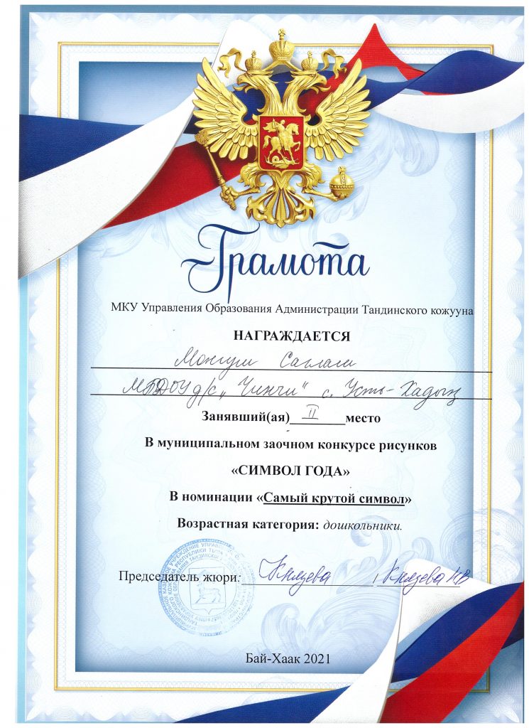 Республиканский дистанционный конкурс рисунков по ПДД «Со светофоровой наукой по зимним дорогам детства»: 1) Оюн А., воспитанник детского сада «Чинчи», занял 3 место в возрастной категории от 3-6 лет; 2) Сандыкчап Х., ученица 5 класса, заняла 3 место в возрастной категории от 7-10 лет (приказ ГБУ ДПО РТ «Республиканский центр воспитания и профилактики правонарушений» от 21.01.2021 г. № 4).